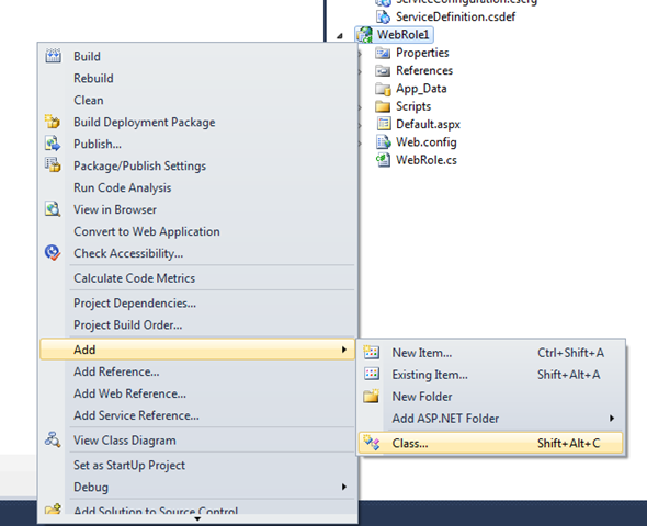 3. Right click on web role project and add a new class. Give a meaningful name to the class. I am giving name here PlayerContext