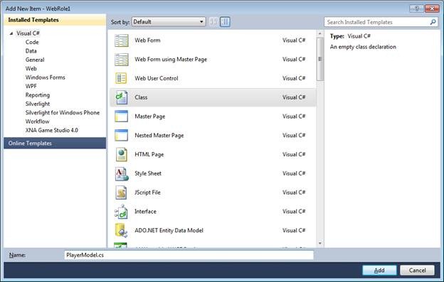 1. Right click on web role project and add a new class. Give a meaningful name to the class. I am giving name here PlayerModel