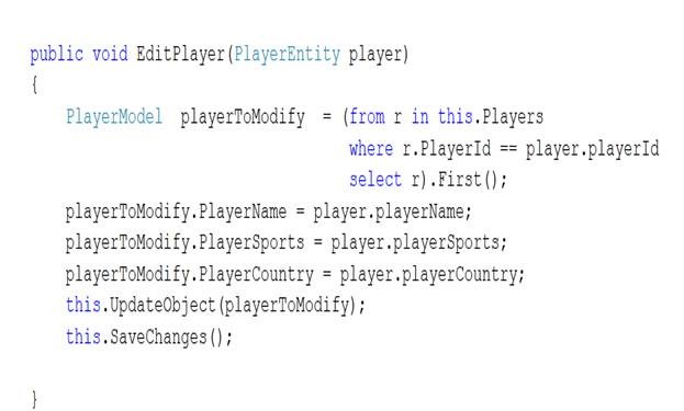 c. Call EditPlayer method passing object of PlayerEntity class.