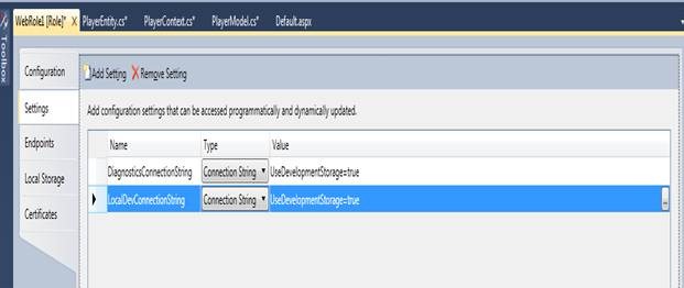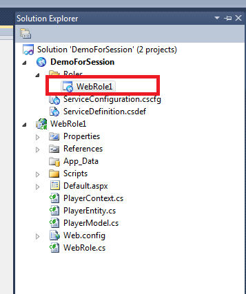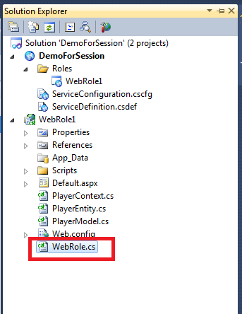 1. Right click on web role project and add a new class. Give a meaningful name to the class. I am giving name here PlayerEntity