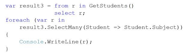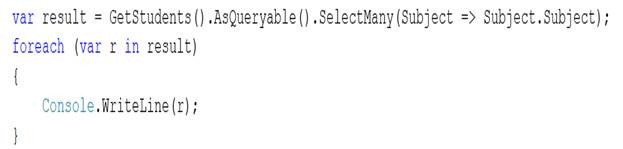 var result = GetStudents().AsQueryable().SelectMany(Subject => Subject.Subject);