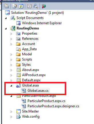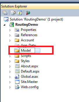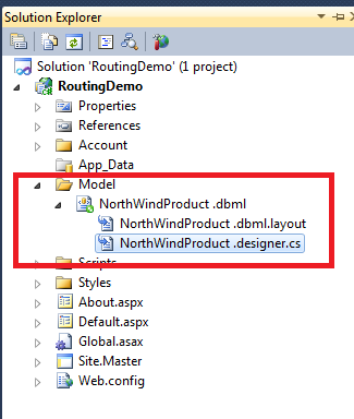 h. In solution explorer you can see inside Model folder three files. There is a NorthWindProductDataContext class inside RoutingDemo.Model name space , we will be using as data context