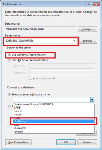 Give data base server name at first. Select the authentication mode, you use to connect to your database and then select NorthWind data base. After giving these three fields click OK.