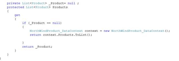 2. Crated a protected property. In getter, I am checking for data member. If it is null, then I am creating instance of NorthWindProduct and fetching all the products.