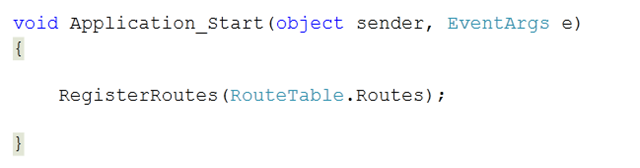 protected void Application_Start(object sender, EventArgs e) { RegisterRoutes(RouteTable.Routes);