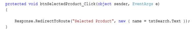 Response.RedirectToRoute("Selected Product", new { name = txtSearch.Text });
