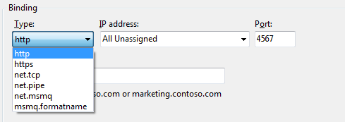 Now at the Binding section select HTTP. Give any port number. I am selecting the port as 4567
