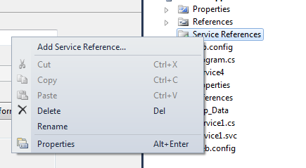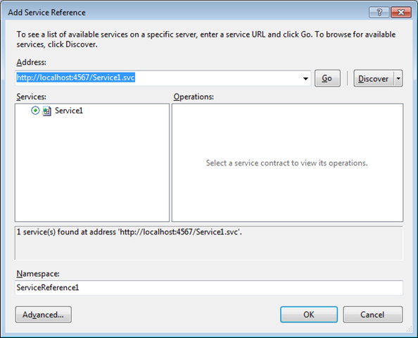 Everything works fine until I get to “Add Service Reference”. I did everything exactly as specified in the walkthrough. When I follow the “Add Service Reference” procedure I get an error message as follows: “There was an error downloading metadata from the address. Please verify that you have entered a valid address.” – (yes, I’m positive the address is valid), And the Details section starts with “Metadata contains a reference that cannot be resolved: ‘http://localhost:4567/Service1.svc?wsdl’, and then later in the Details, “There was an error downloading ‘http://localhost:4567/Service1.svc?xsd=xsd0’. The underlying connection was closed: An unexpected error occurred on a receive.”