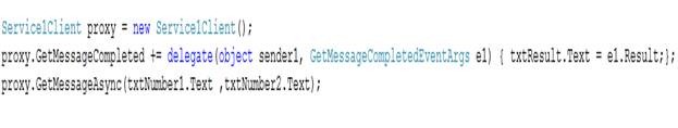 proxy.GetMessageCompleted += delegate(object sender1, GetMessageCompletedEventArgs e1) { txtResult.Text = e1.Result;};