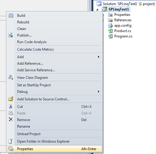 Now add this class to the project. To do this, right click on the project and select Add existing item. Then browse to above path and select Product.cs