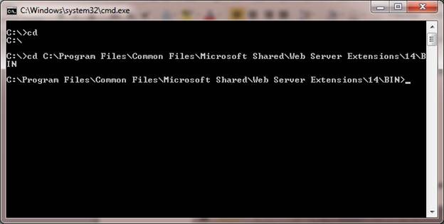 Type command CD C:\Program Files\Common Files\Microsoft Shared\Web Server Extensions\14\BIN