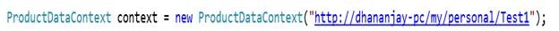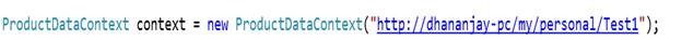 ProductDataContext context = new ProductDataContext("<a href="http://dhananjay-pc/my/personal/Test1">http://dhananjay-pc/my/personal/Test1</a>");