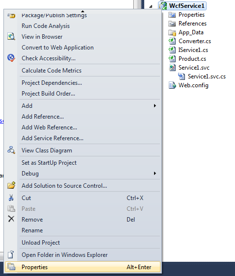 Now add this class to the project. To do this, right click on the WCF Service project and select Add existing item. Then browse to above path and select Product.cs