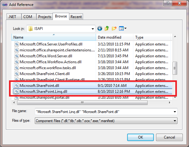Right click on Reference and select Add Reference. To locate Microsoft.SharePoint and Microsoft.SharePoint.Linq dll browse to C:\Program Files\Common Files\Microsoft Shared\Web Server Extensions\14\ISAPI. All the SharePoint dll are here in this location.