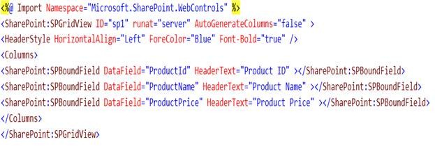 <%@ Assembly Name="$SharePoint.Project.AssemblyFullName$" %> <%@ Assembly Name="Microsoft.Web.CommandUI, Version=14.0.0.0, Culture=neutral, PublicKeyToken=71e9bce111e9429c" %> <%@ Register Tagprefix="SharePoint" Namespace="Microsoft.SharePoint.WebControls" Assembly="Microsoft.SharePoint, Version=14.0.0.0, Culture=neutral, PublicKeyToken=71e9bce111e9429c" %> <%@ Register Tagprefix="Utilities" Namespace="Microsoft.SharePoint.Utilities" Assembly="Microsoft.SharePoint, Version=14.0.0.0, Culture=neutral, PublicKeyToken=71e9bce111e9429c" %> <%@ Register Tagprefix="asp" Namespace="System.Web.UI" Assembly="System.Web.Extensions, Version=3.5.0.0, Culture=neutral, PublicKeyToken=31bf3856ad364e35" %> <%@ Import Namespace="Microsoft.SharePoint" %> <%@ Register Tagprefix="WebPartPages" Namespace="Microsoft.SharePoint.WebPartPages" Assembly="Microsoft.SharePoint, Version=14.0.0.0, Culture=neutral, PublicKeyToken=71e9bce111e9429c" %> <%@ Control Language="C#" AutoEventWireup="true" CodeBehind="VisualWebPart1UserControl.ascx.cs" Inherits="VisualWebPartProject1.VisualWebPart1.VisualWebPart1UserControl" %> <%@ Import Namespace="Microsoft.SharePoint.WebControls" %> <SharePoint:SPGridView ID="sp1" runat="server" AutoGenerateColumns="false" > <HeaderStyle HorizontalAlign="Left" ForeColor="Blue" Font-Bold="true" /> <Columns> <SharePoint:SPBoundField DataField="ProductId" HeaderText="Product ID" ></SharePoint:SPBoundField> <SharePoint:SPBoundField DataField="ProductName" HeaderText="Product Name" ></SharePoint:SPBoundField> <SharePoint:SPBoundField DataField="ProductPrice" HeaderText="Product Price" ></SharePoint:SPBoundField> </Columns> </SharePoint:SPGridView>