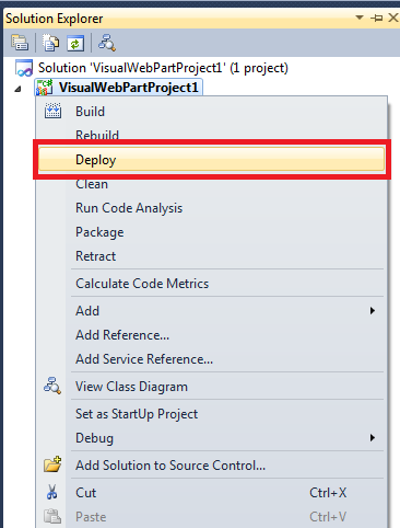Deploy the WebPart to SharePoint site. For that we need to right click on the Visual Web Part project and click Deploy.
