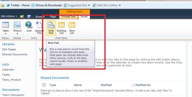 After clicking Insert select WebPart to insert