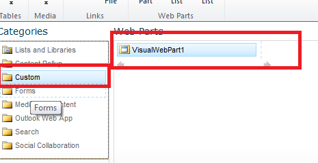 Note: Name of the project we created in first step. Name I gave was VisualWebPart1 . In custom category you will find name you gave of the project in step1.