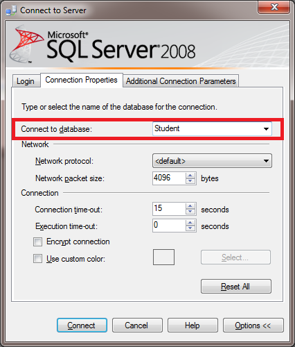 Provide the database name you want to connect by default. I am connecting to Student database.