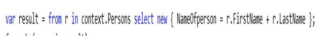 var result = from r in context.Persons select new { NameOfperson = r.FirstName + r.LastName };