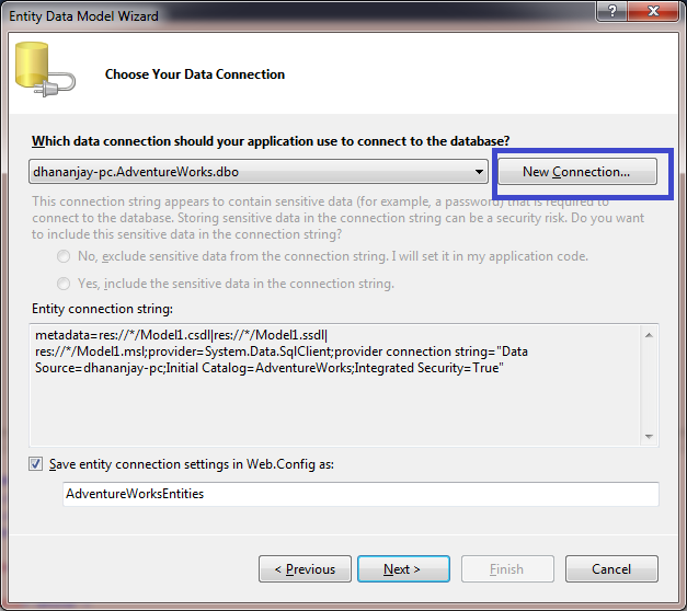 Either leave default name for connection string in config file or give a unique name. and after selecting table click finish.