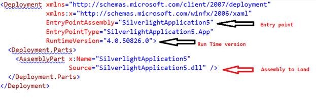 If you open AppManifest.xaml file, you will see above information are provided there. There is only one assembly of Silverlight application is listed in Deplyment.Parts section. If you have referred any other assembly in Silverlight application then information of that assembly will also be listed in Deployment.Parts section.