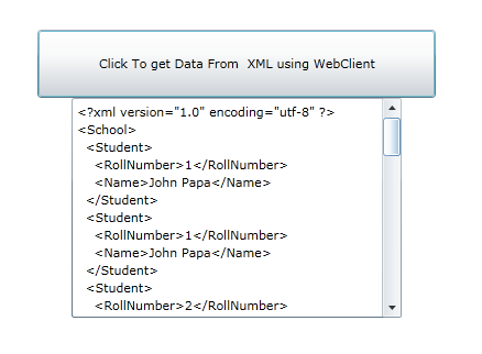 <Grid x:Name="LayoutRoot" Background="White"> <StackPanel Orientation="Vertical" Margin="50,50,50,50"> <Button x:Name="btnDemo" Content="Click To get Data From XML using WebClient" Height="62" Width="362" /> <ScrollViewer VerticalScrollBarVisibility="Auto" HorizontalScrollBarVisibility="Auto" Height="200" Width="300"> <TextBlock x:Name="txtDataFromXml" Width="Auto" Height="Auto" /> </ScrollViewer> </StackPanel> </Grid> </UserControl>