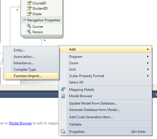 Now open EDMX file and right click on that. Select Add and then select Function Import.
