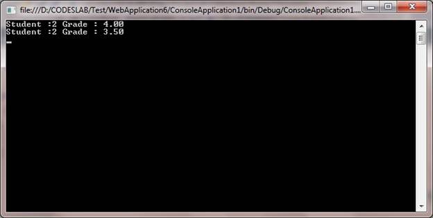 Console.WriteLine("Student :" + r.StudentID.ToString() +" Grade : " + r.Grade);