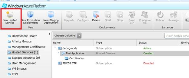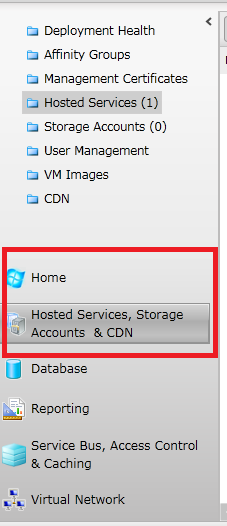 In left panel you will get Hosted Service listed. I have one Hosted Service created and that is listed as count next to Hosted service option. To create new service click on Hosted Service , Storage Account and CDN option.