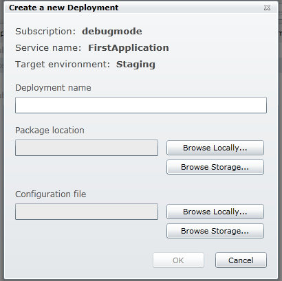 We need to provide Deployment name and need to browse to package file and configuration file. We created and packaged ASP.Net Application on local system. So we will select Browse Locally option. If we have configuration fie and package file in some of storage like BLOB then we will choose Browse Storage option.