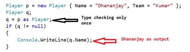 In above snippet, C# checks type compatibility twice and it costs the performance. So to simplify above code and improve performance C# gives us as operator to compare.