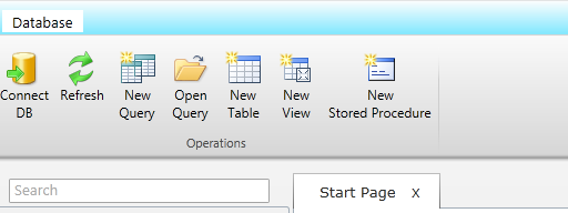 You can perform all the database operations from the top ribbon. You have option to create new query, new table, new view, and new stored procedure