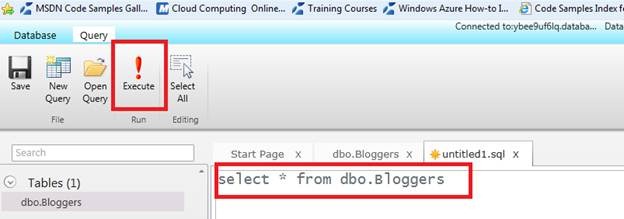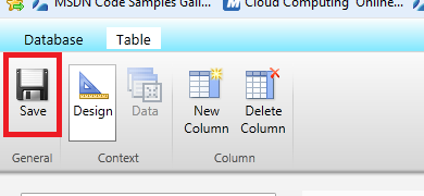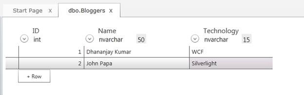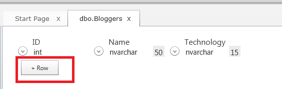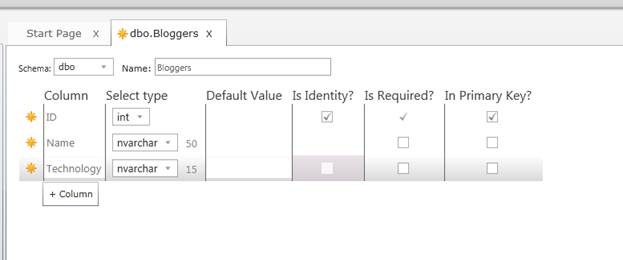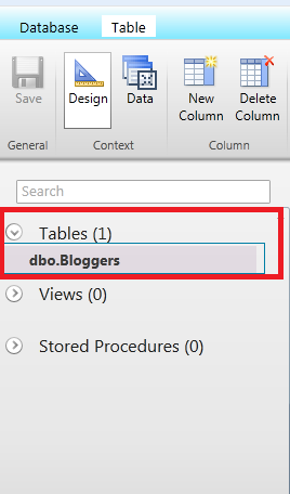 If we want to create new table, click on New Table option from ribbon. We are creating a table with name Blogger. We are giving there columns ID, Name and Technology. From drop down we can select data type for the columns .