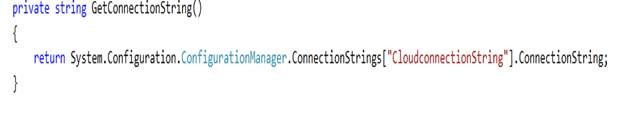return System.Configuration.ConfigurationManager.ConnectionStrings["CloudconnectionString"].ConnectionString;