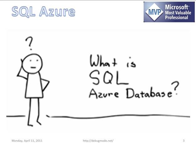 My first slide left the audience with a smile because I did not directly answer the question “What is SQL Azure Database? “ And I told them there are About 5,480,000 results (0.11 seconds) on the Google so there is no need for me to preach on this, just let us start coding.