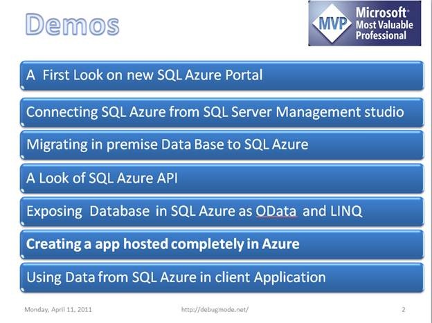 I started with a look on new SQL Azure portal. And I gave demo on the below topics.
