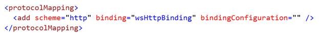 <?xml version="1.0" encoding="utf-8" ?> <configuration> <system.serviceModel> <protocolMapping > <add scheme ="http" binding ="wsHttpBinding" bindingConfiguration ="" /> </protocolMapping> </system.serviceModel> </configuration>