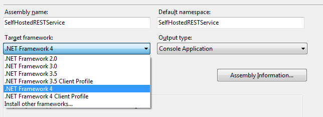 3. From Application tab, if you see by default .NET Framework 4 Client profile is selected. Change that to .NET Framework 4.0. So your target framework should be .NET Framework 4.0.