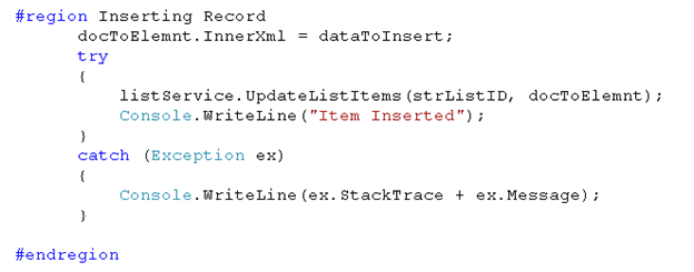As of now we have created the data to be inserted in the list. To do the actual Insertion assign created data as inner XML of XML document and call the UpdateListItem() method of SharePoint Service