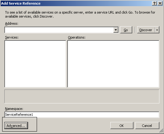 Before start writing code to insert multiple rows, we need to ass Web Service in console program. To do that right click on console application and select Add service Reference. Click on Advanced button and select Add Service Reference .