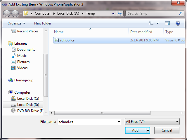 Right click on the project and add existing item. Then navigate to Temp folder where you have created the WCF Data Service proxy class. In our case, it is School.cs. We created this in the previous step.