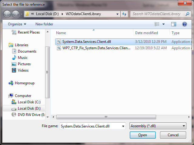 Now we need to add ODATA client library reference in the Windows 7 Phone application. Right click on the project and add reference. Navigate to the folder where you saved System.Data.Service.Clientdll