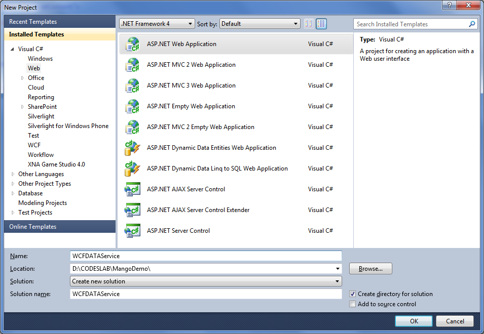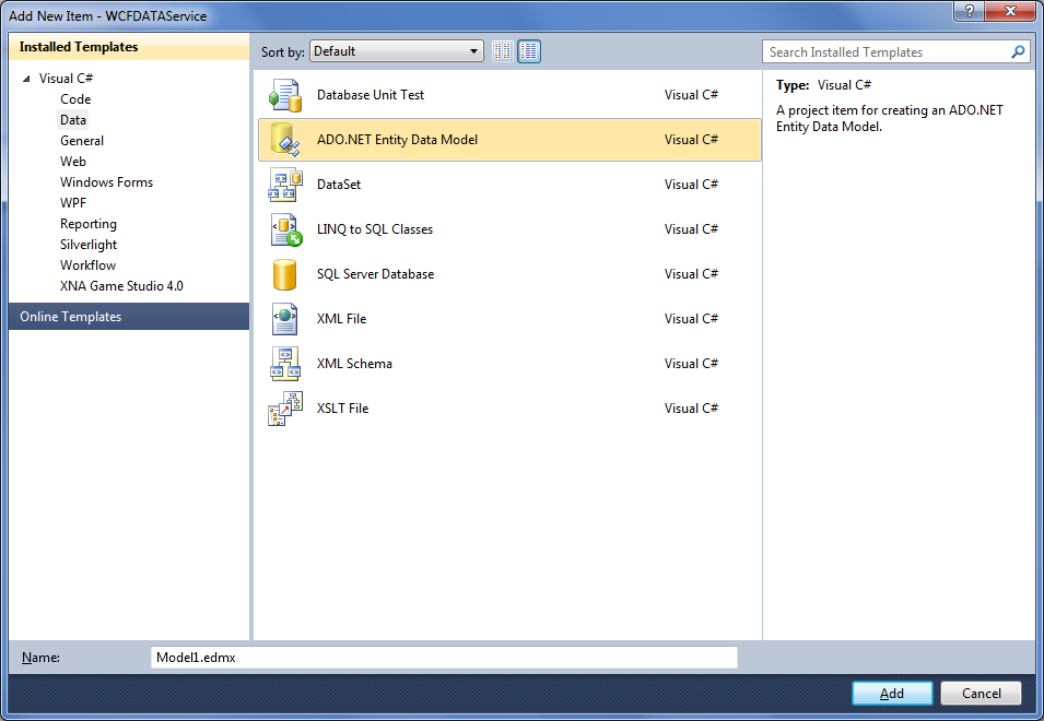 - Select WCF Data Service from Web tab. Give any meaningful name. I am leaving the default name here.