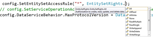 Now we need to set access rules for the entity or entity set. Since we have only one table; so either we can give name of the table explicitly or if we want to set the same access rule for all the table in the data model or data source, we can put *.