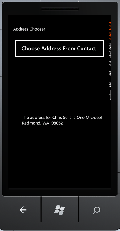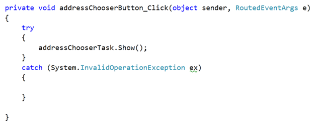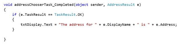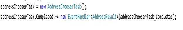 addressChooserTask.Completed += new EventHandler<AddressResult>(addressChooserTask_Completed);