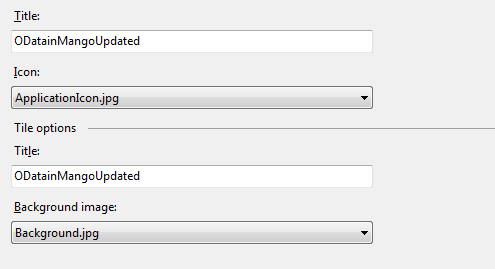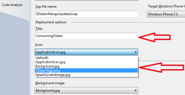 Right click on the application in solution explorer and click on Properties .In properties windows select application tab and here you can change the default values. In drop down for Icon and background image, now you will get OData-logo.png image also to select from.