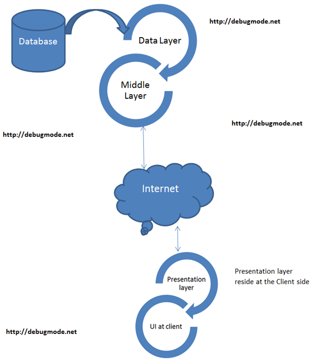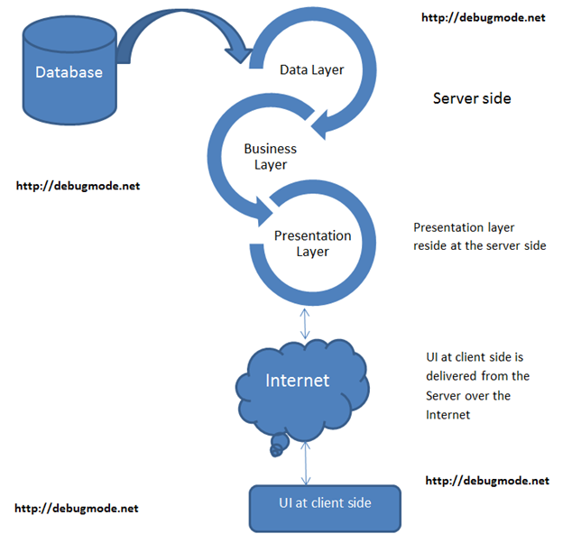It is presentation layer talks to business layer and yield UI output to the client. In normal web application UI output at the client talks to presentation layer over Internet. There is extremely close proximity between presentation layer and business layer and so in between business layer and data layer. Somehow UI rendered at client side does not contain any business specific code and takes instruction from presentation layer and render the html output.