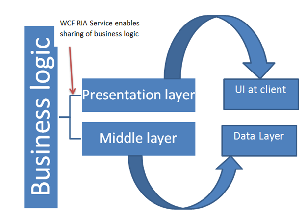 WCF RIA Service shares application logic between view [Presentation layer] and data access layer within a trust boundary. WCF RIA Service eliminates WCF or web service to share the application logic between the layers over Internet. WCF RIA Service acts as a plug in between presentation layer and middle layer. It creates a programming view between these layers to work with application logic.