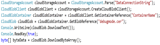 CloudBlob cloudBlob = cloudBlobContainer.GetBlobReference("debugmode.cer");